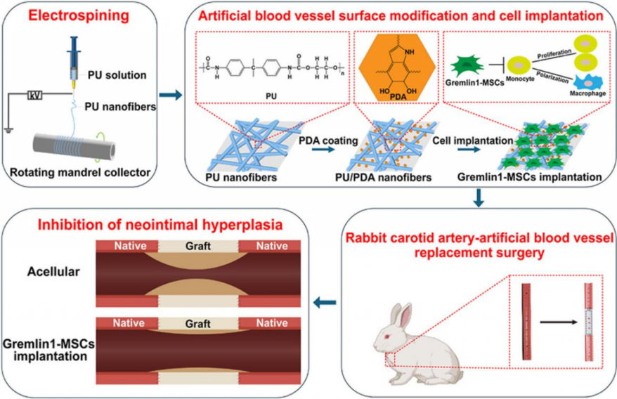 中山大学向秋玲刘瑞明项鹏合作揭示Gremlin1修饰间充质干细胞提高小口径静电纺丝聚氨酯人工血管移植通畅率